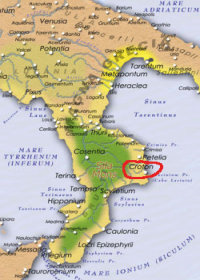 A pesar de ubicarse en la Magna Grecia (nombre dado en la Antigüedad al territorio ocupado por los colonos griegos al sur de la península italiana y Sicilia), los pitagóricos procedían de Jonia, en la que surgió la primera escuela de filosofía. Pitágoras, supuesto fundador de esta escuela, nació en la isla de Samos y por razones políticas (para escapar de la tiranía de Polícrates) tuvo que huir, terminando por asentarse en Crotona (Magna Grecia) donde fundó una comunidad (secta), religiosa, políticas y filosófica.